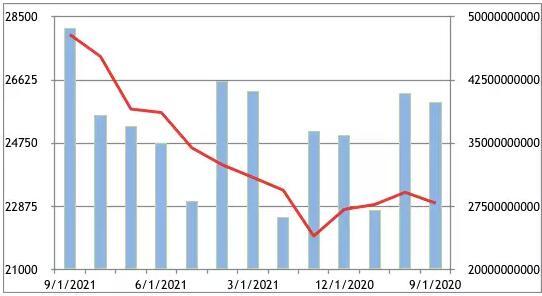 图:2016年8月至2017年8月,恒指走势(红线),成交量(蓝色柱)连涨开始标深