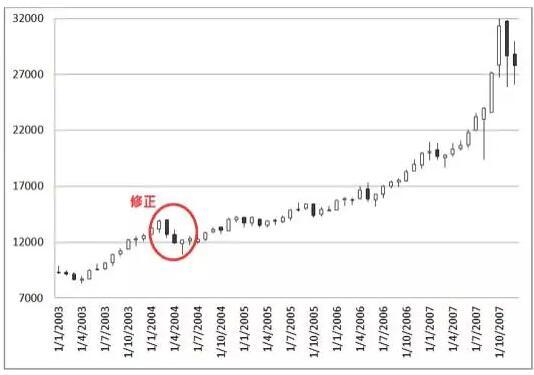 有趣的是如果仔细对比,对上一次成交量同样没有放大太多的2003年港股行情是怎样呢?经过2004年3月和2004年4月两个月大幅下跌的修正后,开始的是波浪壮阔的下一波大牛市行情。