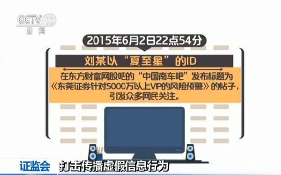 2015年6月2日22点54分,刘某以“夏至星”的ID在东方财富网股吧的“中国南车吧”发布标题为《东莞证券针对5000万以上VIP的风险预警》的帖子,引发众多网民关注。