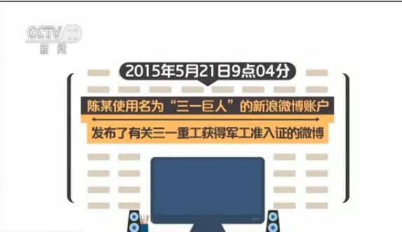 2015年5月21日9点04分,陈某使用名为“三一巨人”的新浪微博账户发布了有关三一重工获得军工准入证的微博。