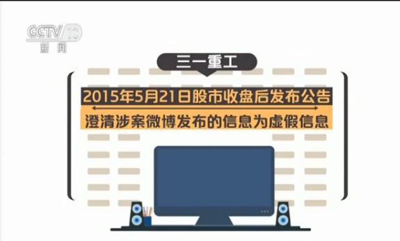 证监会执法人员:下午开盘仅仅两分钟的时间,大量买盘就涌入了三一重工,造成了三一重工的股价涨停,三一重工不得不在2015年5月21日股市收盘以后发布公告,澄清涉案微博发布的信息为虚假信息。
