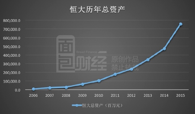 下图是面包财经(微信公众号ID:mbcaijing)根据财报数据绘制的恒大总资产变动图: