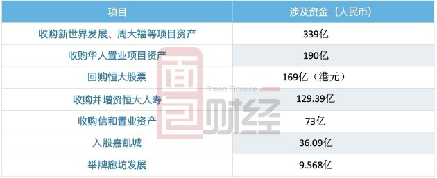 从新世界发展、华人置业和信和置业等港资巨头手中接项目买资产花了接近600亿人民币;入股并增资恒大人寿花掉接近130亿;至于在嘉凯城、廊坊发展身上花掉的45.6亿充其量是餐后甜点。忙里偷闲,恒大过去两年多还斥资超过169亿港元用于回购自家股票,位列港股回购榜榜首。至于在内地收购的其他房产项目、拍卖土地、顺手入股恒腾网络、包括此前买入华夏银行股份,都还都不在榜单。