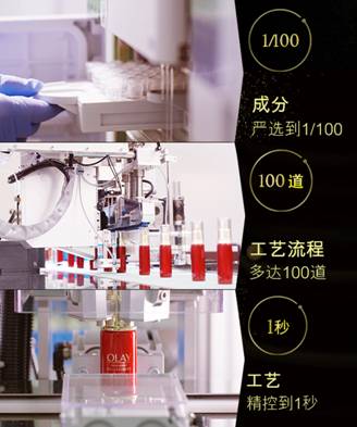 精确生产,精准到秒:OLAY新生塑颜臻粹系列每一个生产操作步骤都被精准到秒,每1个原材料的添加称量精度可以精控在万分之一。精细筛选的原材料就在精确生产的车间里,最终转化为中国女性指尖的一抹精华或乳液,获得与扭转时光的神奇力量。