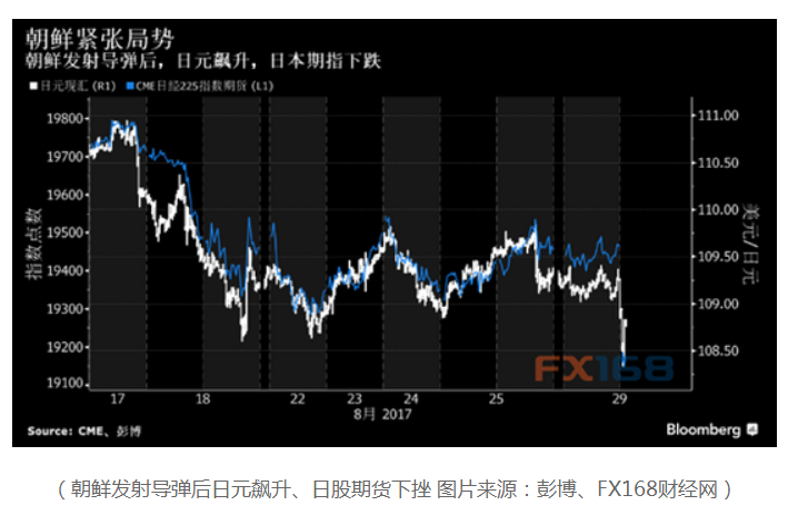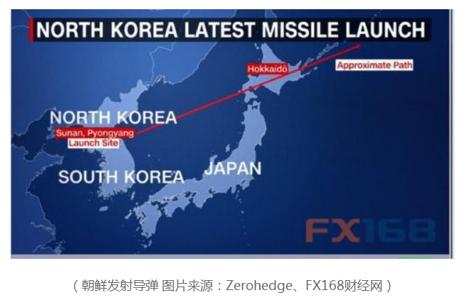 朝鲜周二(8月29日)早间发射了一枚导弹,这枚导弹飞过日本领空并落入北海道附近的海域,令朝鲜半岛紧张情势急剧升级,日本内阁官房长官称导弹飞越日本领土之事史无前例。受该消息影响,日元、瑞郎、黄金等避险资产应声大涨,美股期货重挫。