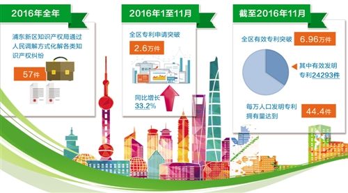 2016年,浦东新区知识产权局通过人民调解方式化解各类知识产权纠纷57件。与此同时,在服务和政策的双重推动下,浦东的知识产权创造数量和质量快速提升。2016年1至11月,全区专利申请突破2.6万件,同比增长33.2%。