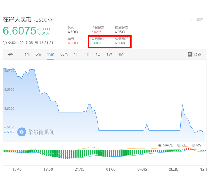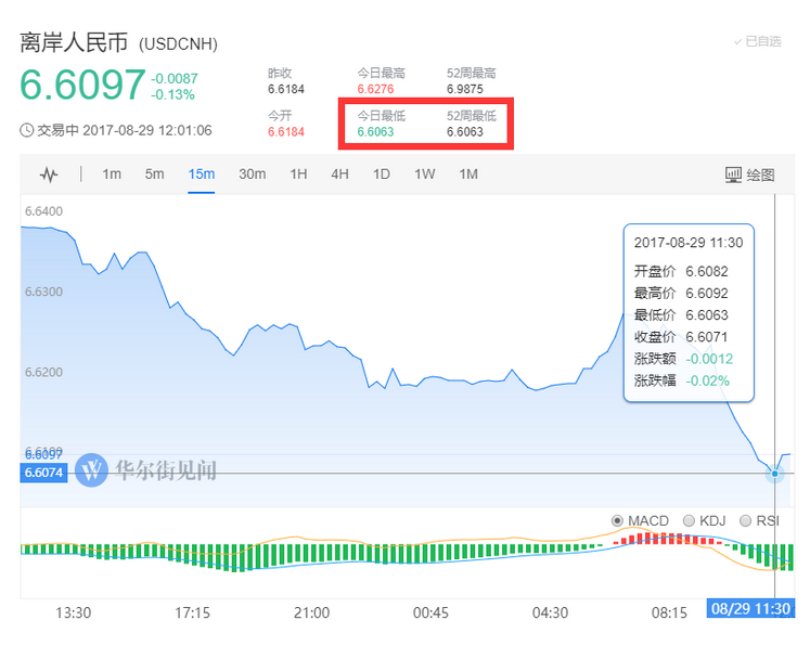 随着美元疲软持续,人民币汇率一路走高。美元/离岸人民币日内最低达6.6063,美元/在岸人民币日内最低达6.6060,均创52周新低,直奔6.60。