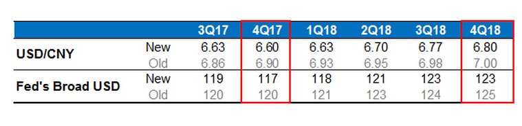 大摩首席中国经济学家邢自强邢自强认为,人民币汇率2017年末预期上调至6.60(vs. 彭博问卷市场共识的6.85)、2018年末上调至6.80(vs. 彭博问卷市场共识的6.90),符合今年美元兑一篮子货币汇率走弱的背景。
