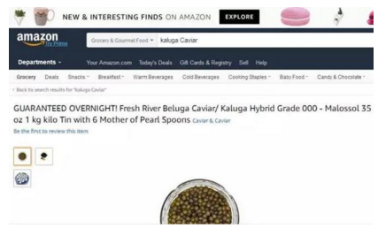 每经小编(微信号:nbdnews)在亚马逊官网找到了该中国品牌旗下的大白鲟鱼子酱(Beluga Caviar)。据了解,大白鲟鱼子酱属于顶级黑鱼子酱的一种。