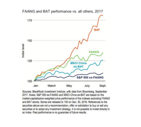 图中显示,中国的BAT(百度,阿里以及腾讯)今年以来的股价走势(橘红色),远超美国科技股的领头羊FAANG(Facebook, 亚马逊苹果Netflix以及Google) 的绿色线。而刨除BAT的中国概念股的走势,也远超美国标准普尔走势。