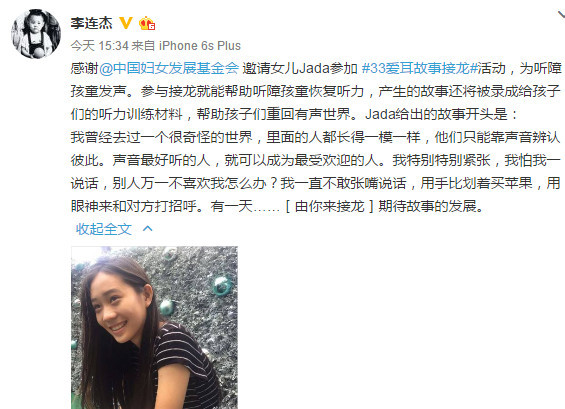 腾讯娱乐讯 3月3日下午,李连杰在微博晒出女儿照片,并写道:“感谢@中国妇女发展基金会邀请女儿Jada参加 #33爱耳故事接龙#活动,为听障孩童发声。参与接龙就能帮助听障孩童恢复听力,产生的故事还将被录成给孩子们的听力训练材料,帮助孩子们重回有声世界。Jada给出的故事开头是:我曾经去过一个很奇怪的世界,里面的人都长得一模一样,他们只能靠声音辨认彼此。声音最好听的人,就可以成为最受欢迎的人。我特别特别紧张,我怕我一说话,别人万一不喜欢我怎么办?我一直不敢张嘴说话,用手比划着买苹果,用眼神来和对方打招呼。有一天……[由你来接龙]期待故事的发展。”