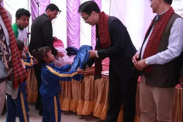 仪式结束后,现场嘉宾向在校学生发放了苏宁员工捐赠的700个爱心书包,尼泊尔现代出版社高塔姆先生向学校捐赠尼泊尔语的中国故事丛书,受到全场师生的欢迎。