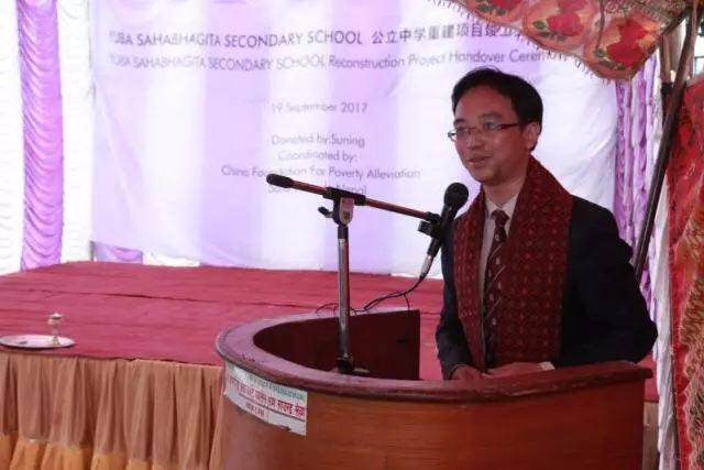 中国驻尼泊尔大使馆参赞杨时超先生高度赞扬了中国优秀企业苏宁集团的爱心支持,肯定了中国扶贫基金会民间外交所做出的努力,并表示Yuba Sahabhagita学校的竣工谱写了“一带一路”倡议下中尼友好的新篇章。