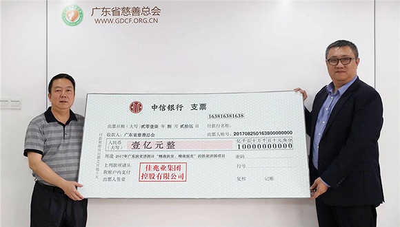 佳兆业集团向广东省慈善总会“2017年广东扶贫济困日活动”捐赠1亿元人民币
