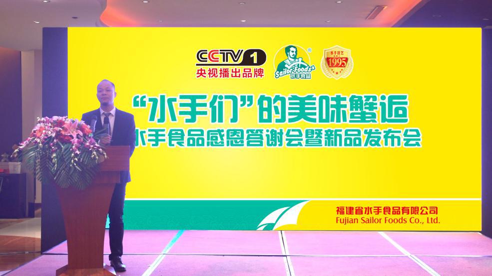 2017年10月15日,东北第一大城辽宁沈阳,福建省水手食品有限公司与中央电视台达成战略合作,荣登“央视播出品牌”。水手食品董事长陈文水、央视代表冯铭宇、水手食品高层领导以及来自福建、广东、浙江、安徽、江苏、河南、辽宁、吉林、黑龙江等全国各地的合作伙伴近百人,共同出席“福建省水手食品感恩答谢会暨新品发布会”,见证本次签约仪式。