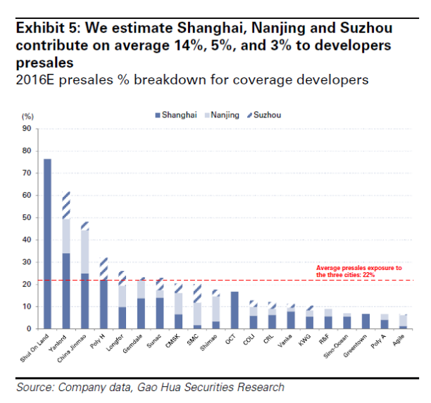据高盛高华统计,上海、南京、苏州三地占开发商预售份额分别为14%、5%和3%。