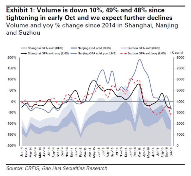 高盛高华称,自10月份收紧政策以来,上海、南京、苏州三地的交易量已经分别下跌10%,49%和48%。高盛高华认为未来还将有进一步下跌。