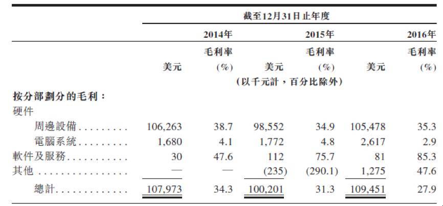 不过,近几年雷蛇的总体毛利率呈下滑趋势,从2014年的34.3%降到2016年的27.9%,其中主要原因在于周边设备和电脑的毛利率下滑。
