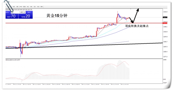1:金价回撤起涨点1312-13.5多,止损1308即可,目标1322-1325,破位持有。另外,如果亚盘守住了1312早上的起涨点位置,那么午后14:00左右可以界入顺势多单即可。